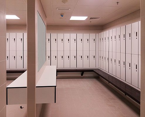 Our team knew the end product would have to enhance the interior design of the space while providing durability required for busy public change rooms. We worked with high-pressure laminate panels manufactured with solvent, scratch and impact resistant surface material to create all product lines. We successfully designed, manufactured and installed bespoke white integrated benches with our popular compact laminate two-tier lockers. Two hundred and sixty-one of these locker units featured standard cylindrical locks with master key, with recessed D-handle for the locker shutters and 2.7m long satin anodized aluminum framed integrated benches. Aside from the locker system, the team installed six shoe rack cabinets and forty-four washroom cubicle solutions that were manufactured to carry out the same white themed concept to match the clean and modern design.